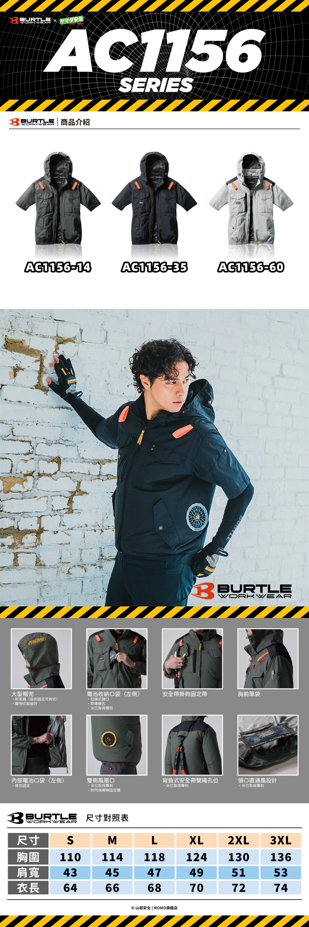 .配備可拆式兜帽、背部繫繩孔,對應背負式安全帶穿戴。
